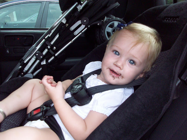 So I was a bad mom and on our way back from Kroger today I needed to keep Aubrey happy and awake so I introduced her to the wonderful world of oreos. I gave her an oreo on the way home from Kroger and she kind of loved it. And here's the aftermath.....